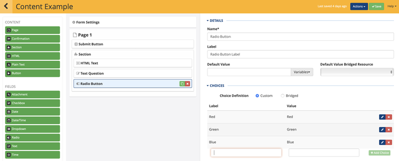 - Choices - when set to Custom, you determine the list of options with a Label/Value pair. Bridged is covered in a later article.