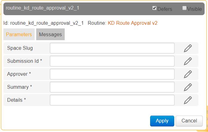 Adding the KD Route Approval node will route an approval to the desired individual using the approval form listed in the Approval Form attribute for that Service. To use a different form, you can use any of the other approval routines shown below: