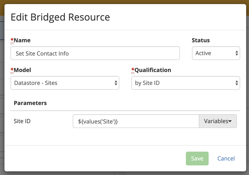 Set fields lets you place values into Fields on your Form. It is normally associated with a Bridged Resource, but it isn't required. In our case we are adding more information about the site to the Cleaning Form, so once the Bridged Resource is created, it's a matter of setting information into the Name and contact info fields.