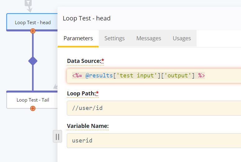 The Loop Head node controls how many times the loop is processed and what data is used with the XML or JSON parameters. The Loop Head is also referred to as Loop Begin in some documentation.